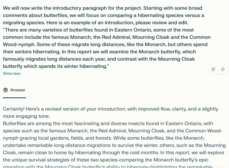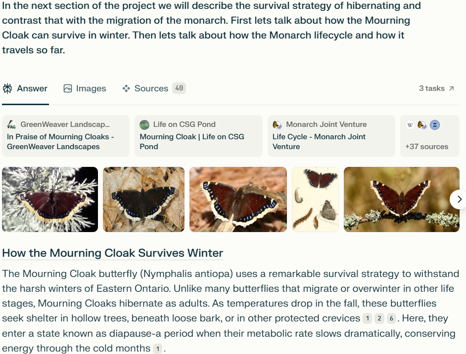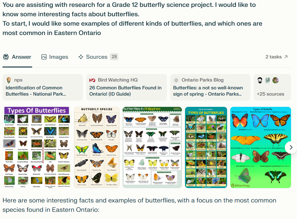 In this example, we’ll use the Perplexity AI assistant to research butterflies for a Grade 12 project. First, we gather general information. Then, based on what interests us, we refine the focus—exploring topics like endangered species or migration patterns—to create a well-structured, insightful report.
