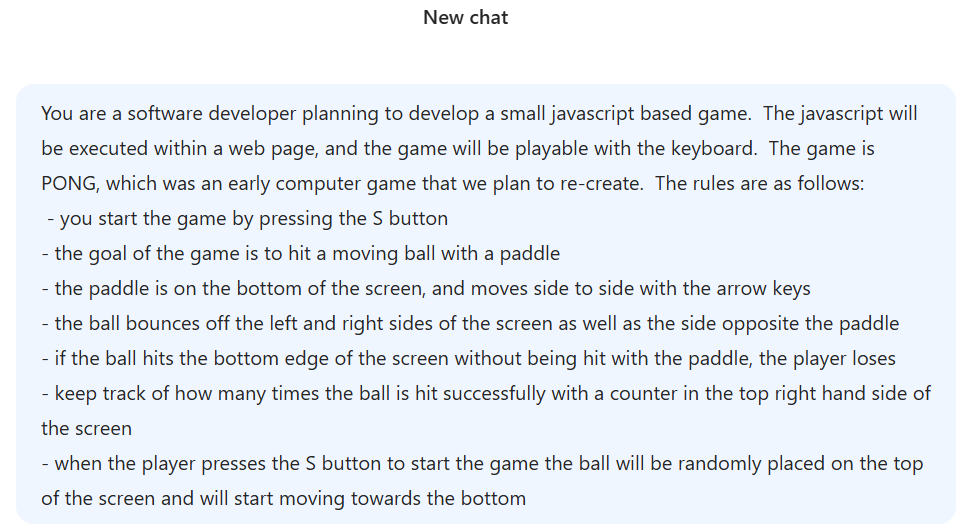For the initial prompt we will provide a role (software developer) and explain what the task is (create a game) and then provide a detailed list of what the rules are for the game.