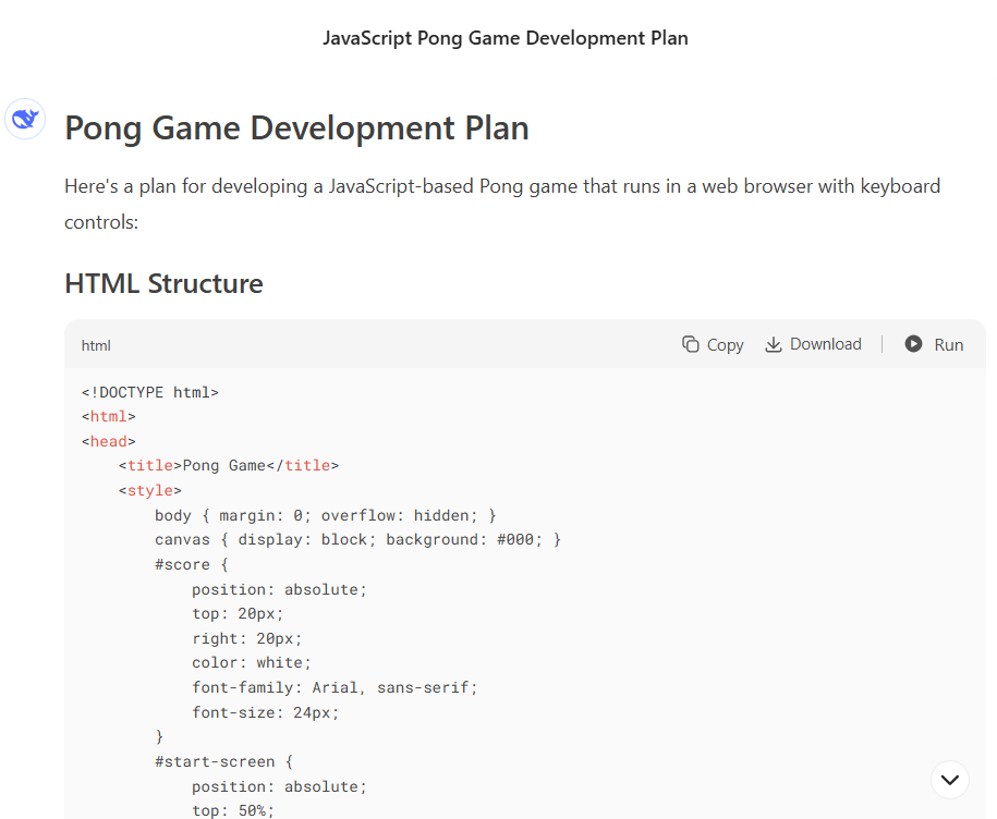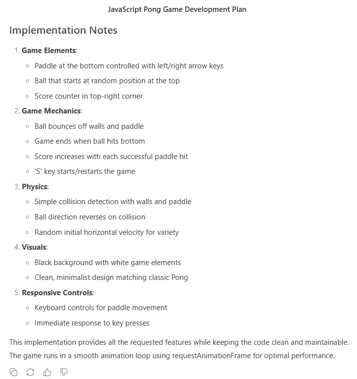 In this example, we developed a small game using an AI assistant, achieving functionality within just a few iterations. The entire process took less than an hour—an impressive feat that would be difficult for a human programmer to match in such a short timeframe. While AI assistants excel at generating and refining code quickly, more complex solutions require careful planning and iterative collaboration. With structured guidance, refinement, and testing, AI-assisted coding can be leveraged to tackle even intricate software development challenges efficiently.