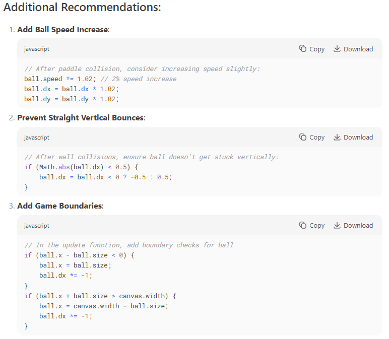 Deepseek also gives some insightful ideas on improvements. This demonstrates that the AI assistant understands the gameplay well enough to be able to provide ideas to improve it beyond the basic rules provided in the initial prompt.